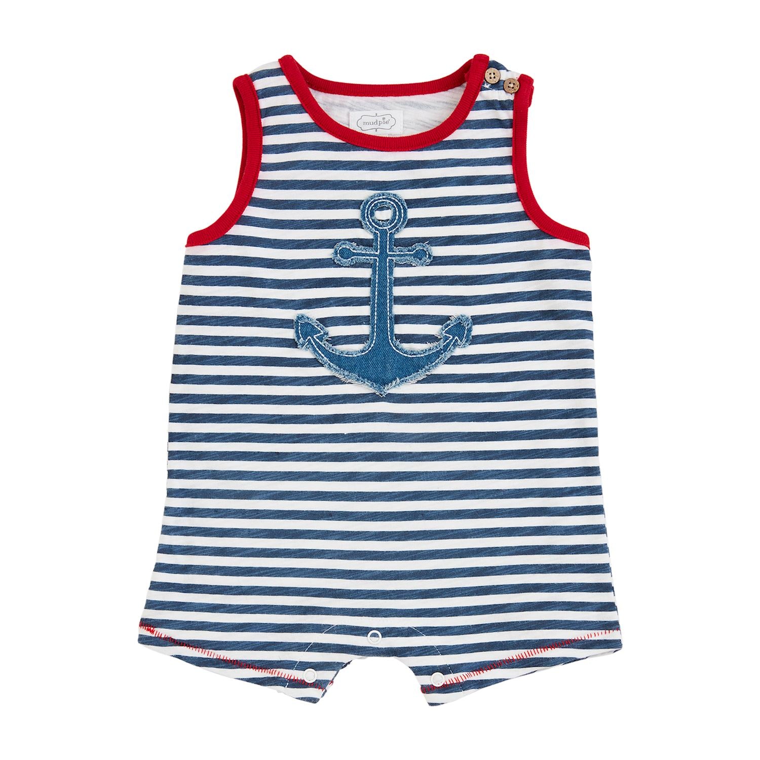 Appliqued cotton slub romper features coconut wood button shoulder. Inner leg snaps.