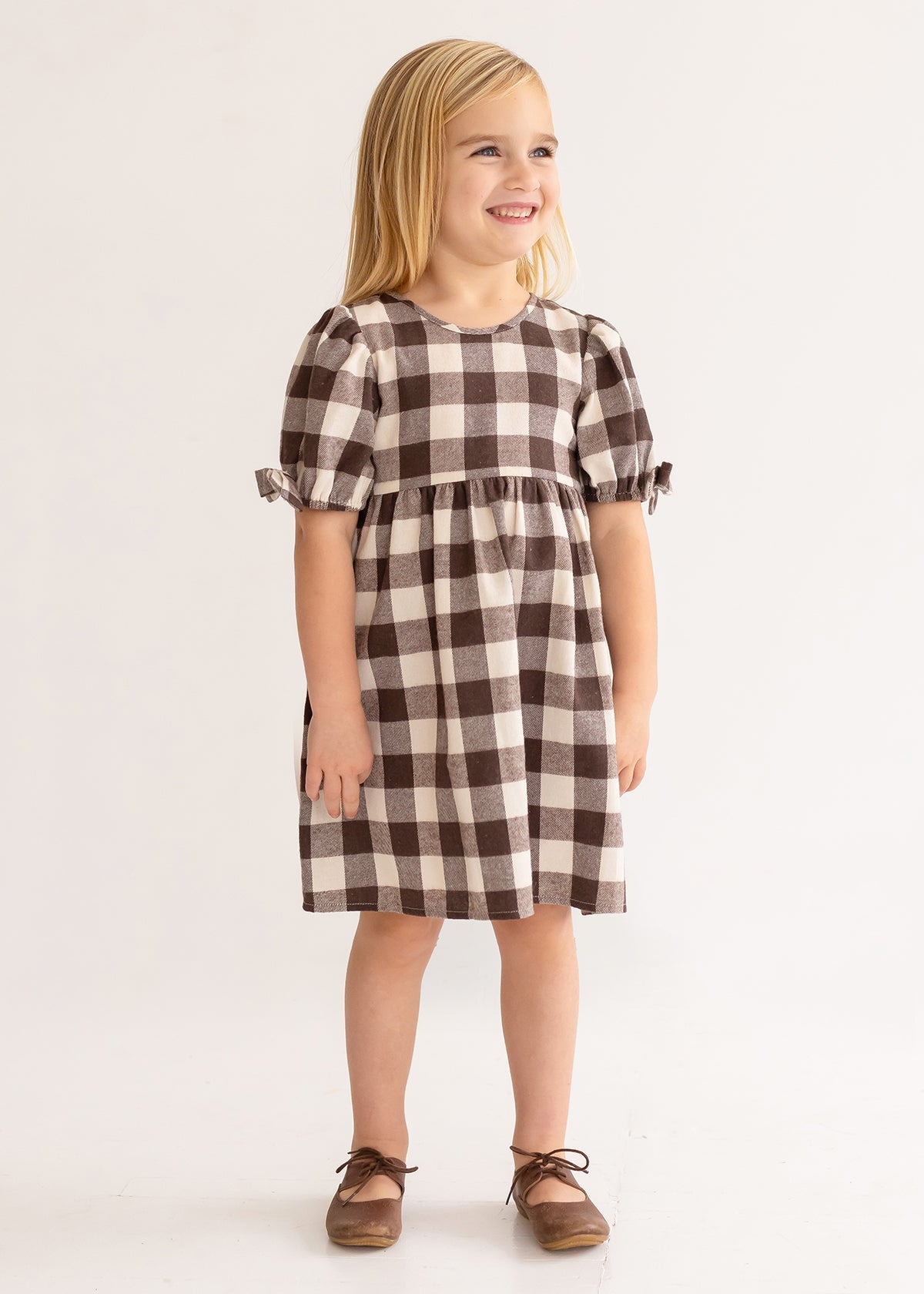 This girl's dress showcases a timeless checkered pattern in rich brown and cream hues. The short sleeves feature charming bow details at the cuffs, adding a sweet touch to the classic design. The dress is cut in an A-line silhouette, offering both style and comfort for everyday wear or special occasions.