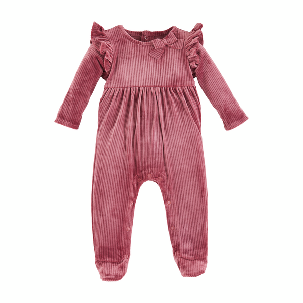 The Berry Velour Baby Sleeper is a charming and cozy addition to your little one's wardrobe. Made from ribbed velour fabric, this footed sleeper offers a soft and luxurious feel against your baby's delicate skin. The neckline bow and shoulder ruffles add a touch of sweetness and femininity to the overall design. With inner leg snaps, diaper changes become quick and hassle-free.