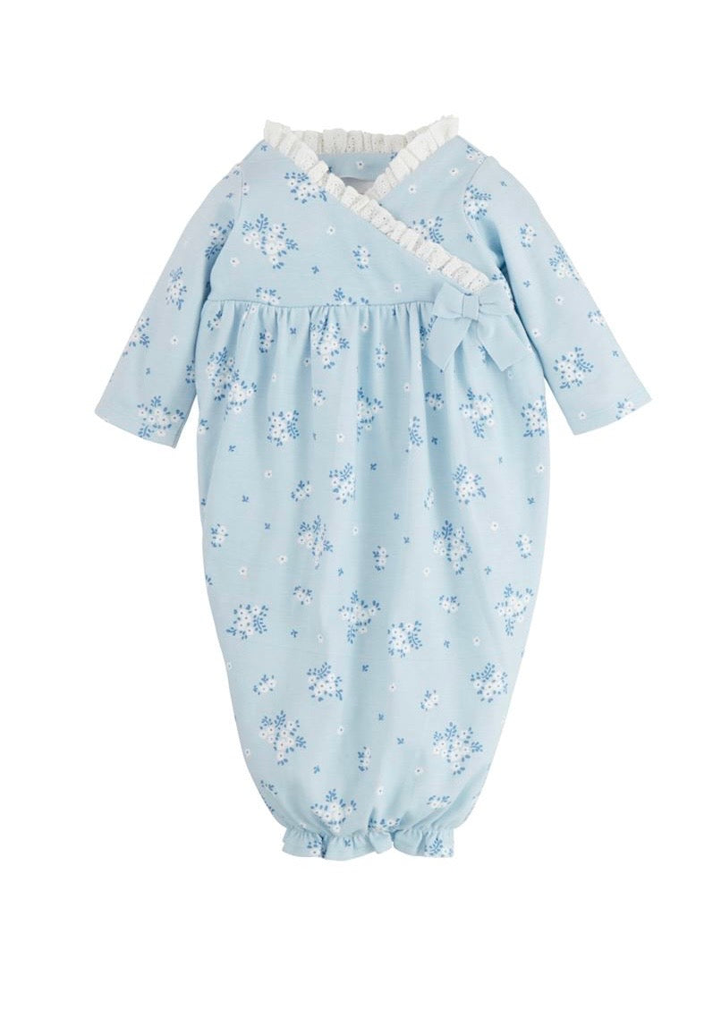 Cotton interlock sleep gown with kimono side bow and ruffle hem.