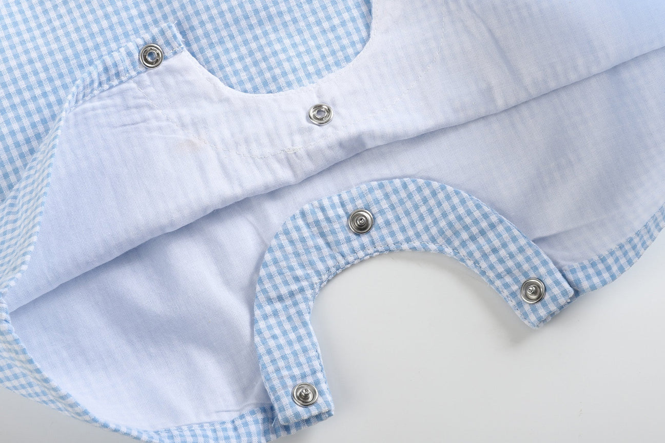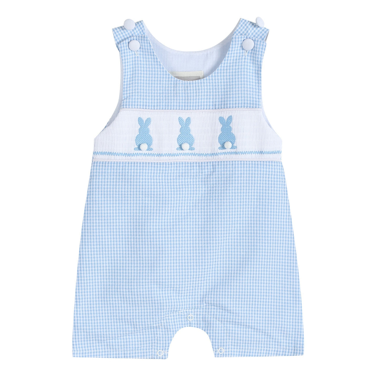 Your little one will hop down the bunny trail in these adorable blue gingham Easter Bunny Smocked Shortalls! Perfect for dressy occasions or everyday play, these stylish overalls feature delicate smocking and sweet embroidered bunnies with pompom tails. Get a jump on the season with this cheerful Easter outfit!