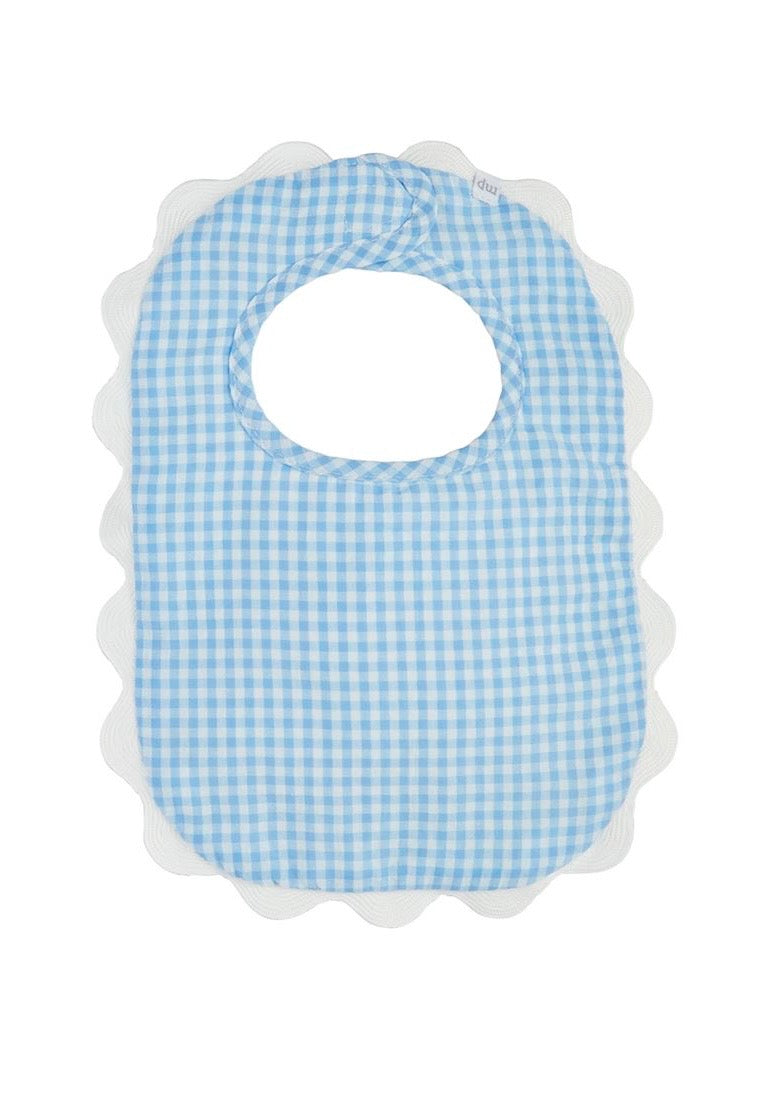 Gingham bib features scallop ric-rac trim and cotton interlock backing. Hook and loop closure.