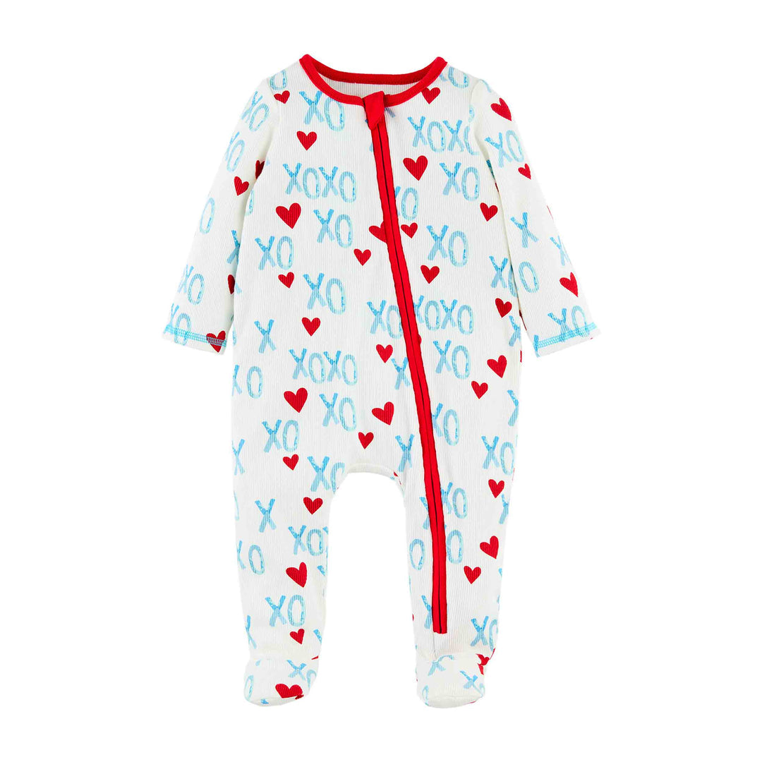 Your little bundle of joy will melt hearts in this adorable Blue Valentine's Day Baby Sleeper. The two-piece set includes a comfortable and stylish footed sleeper that is perfect for snuggling and playing. Crafted from high-quality cotton rib, this sleeper provides ultimate comfort for your baby's delicate skin. The breathable fabric ensures a cozy and soft feel, allowing your little one to sleep soundly throughout the night. Designed with a cross body zipper, this sleeper offers easy diaper changes and dressing. No more struggling with buttons or snaps in the middle of the night. The zipper closure ensures quick and hassle-free access. If your child is in-between sizes, we recommend sizing up for a comfortable fit.