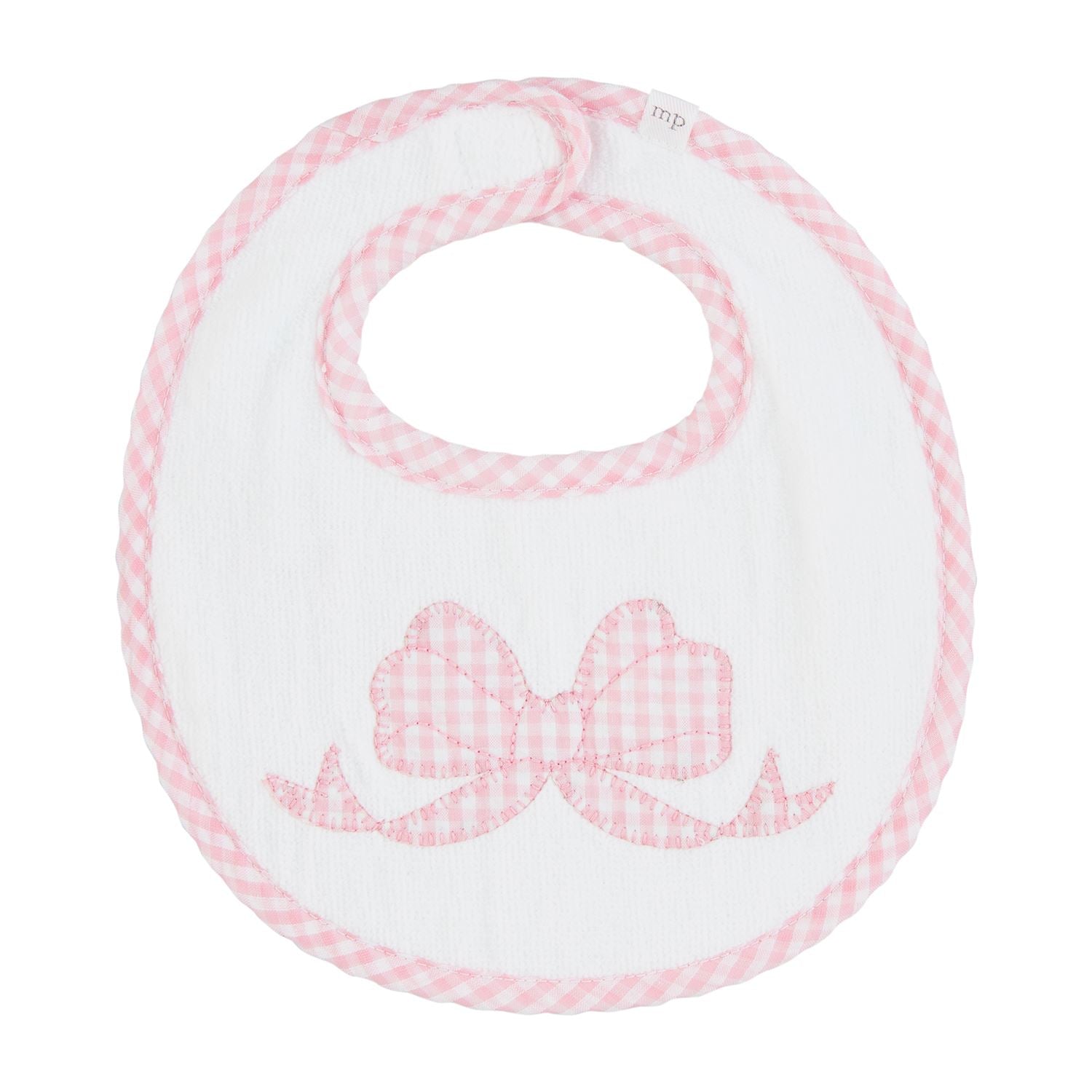 Appliqued velour terry cloth bib with contrast gingham binding and hook and loop closure.