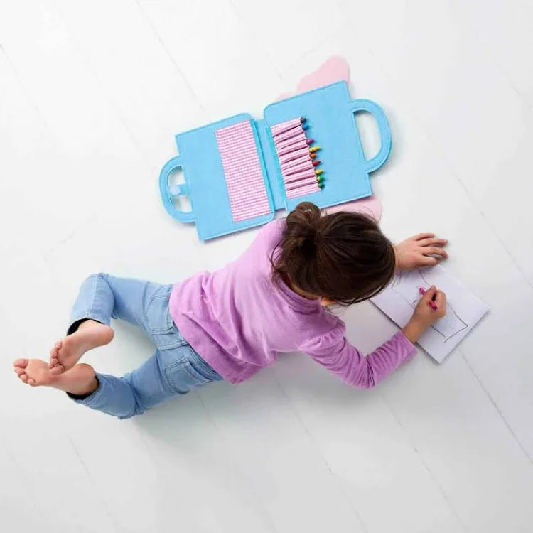 Color anywhere with this adorable butterfly Art Folio Set. The set comes with a felt portfolio that is shaped like a rainbow. The folio includes a drawing pad and 10 crayons of fun colors. This set is perfect for on-the-go entertaining. The art folio is intended for children ages 3 and up.