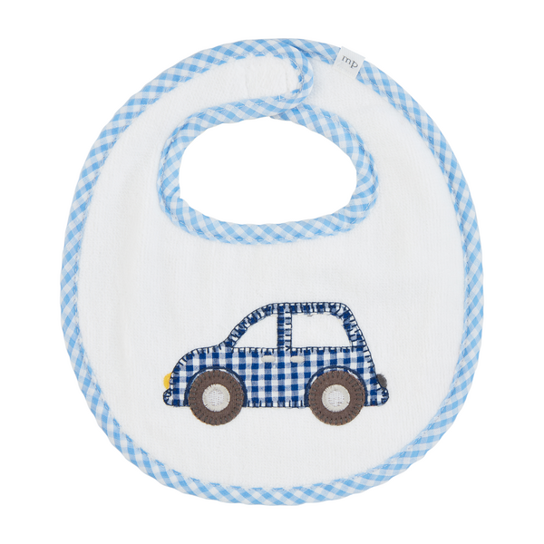 The Car Applique Terry Bib is a practical and enjoyable accessory for children. Crafted from soft and absorbent terry cloth, it is ideal for preventing spills and maintaining cleanliness during meals. The bib showcases an adorable car applique design that is sure to delight kids. With an adjustable snap closure at the back, it is effortless to fasten and unfasten. Additionally, the bib is machine washable for easy cleaning. Whether at home or on the move, this bib is an essential item for any young child.