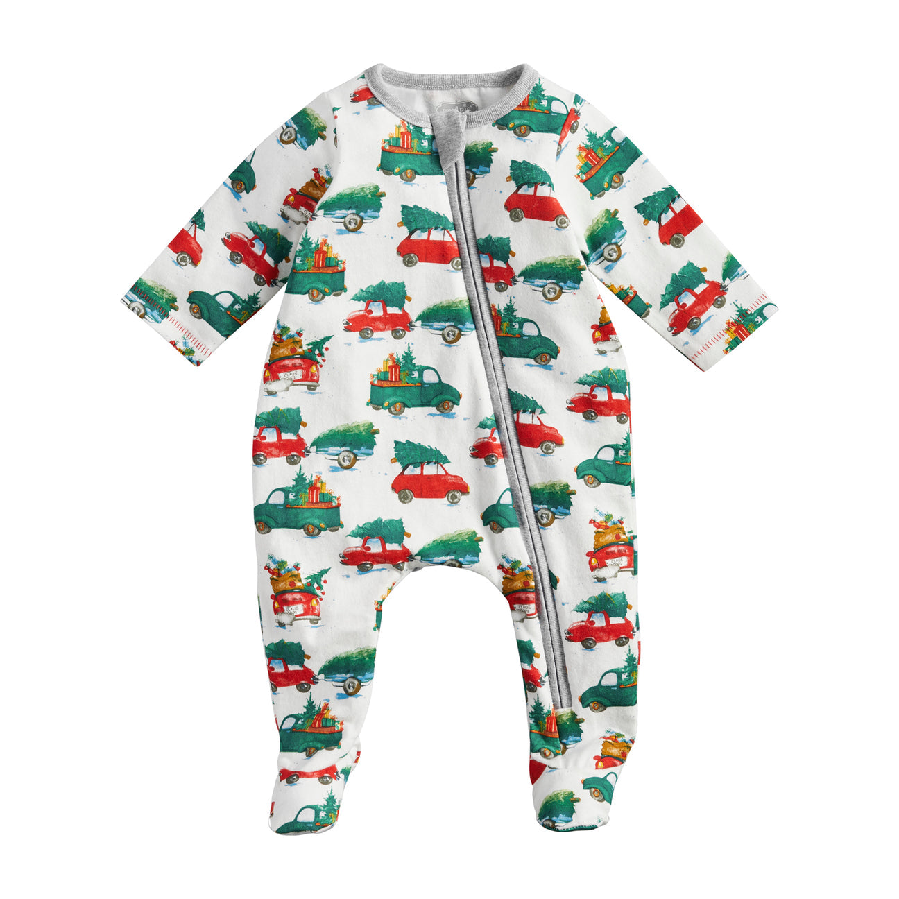 Our Christmas Tree baby sleeper is a fun touch on Christmas pajamas. The jersey footed sleeper features a detailed pattern that has various trucks carrying Christmas Trees. The bodysuit features a body crossing zipper and gray neckline. This sleeper pairs well with our Toddler Christmas Tree pajamas, perfect for sibling matching.