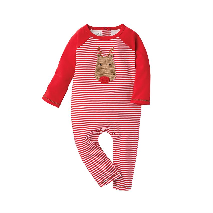 - Printed cotton interlock one-piece features cotton rib sleeves and neckline, reindeer appliqué and inner leg snap closure