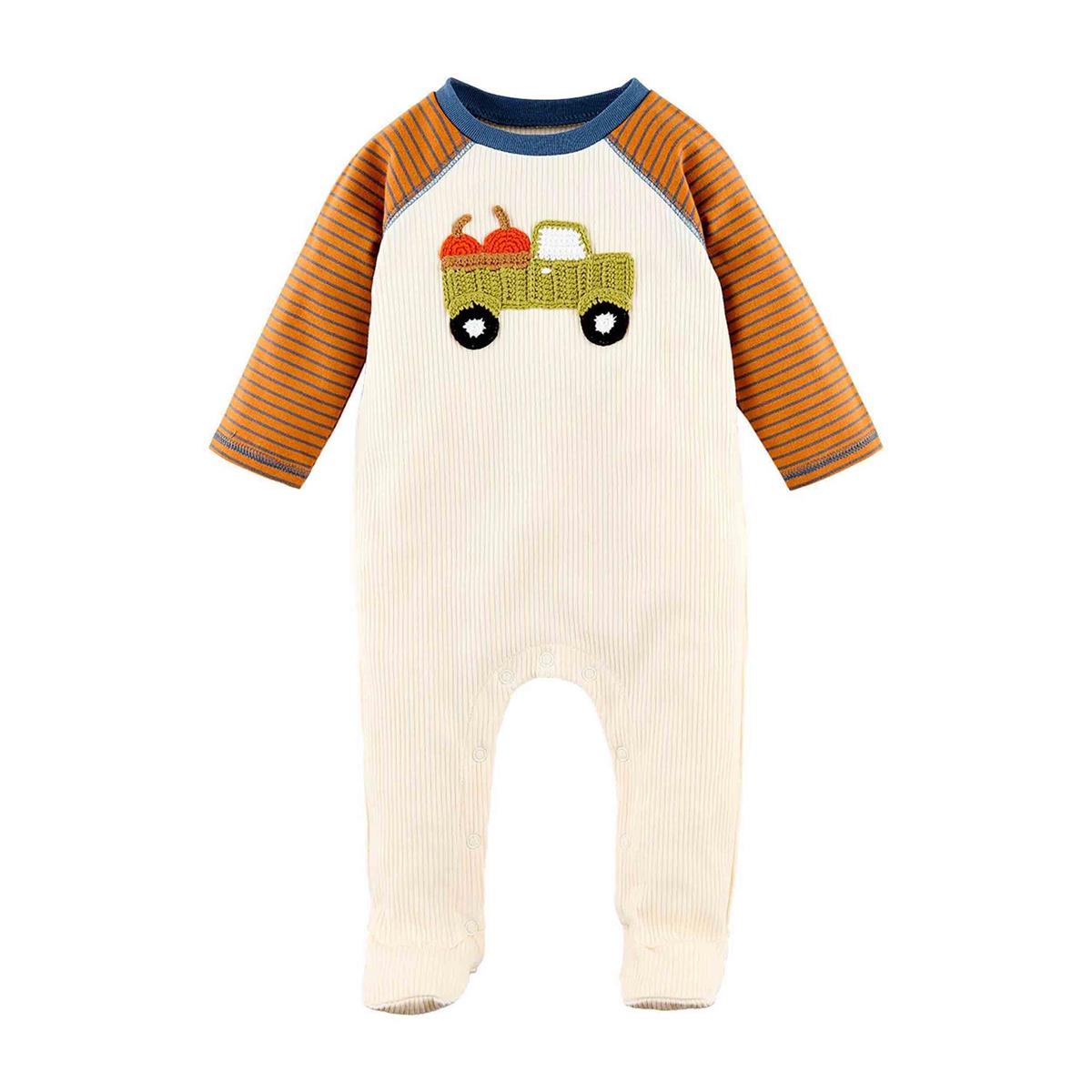 Crochet Appliquéd cotton rib footed one-piece features jersey raglan long sleeves. Inner leg snap closure.