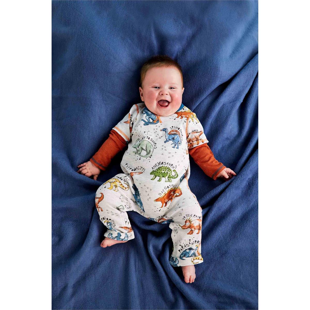 Introducing our Dino Waffle Baby Bodysuit, a must-have for your little one. Crafted with a comfortable waffle weave fabric, this one-piece is designed for optimal style and comfort. The bodysuit showcases layered long sleeves made of a soft cotton spandex blend. With its convenient inner leg snap closure, diaper changes are a breeze. Adorned with an assortment of dinosaur shapes and vibrant prints, this bodysuit adds a playful touch to your baby's wardrobe. Made with a high-quality blend of 54% cotton, 43% polyester, and 3% spandex, this bodysuit ensures durability and a cozy fit. The sleeves are crafted from a blend of 54% cotton, 40% polyester, and 6% spandex for added flexibility. Cleaning is a cinch ? simply turn the bodysuit inside out and machine wash on a cold cycle with similar colors. For drying, tumble dry on low for convenience.