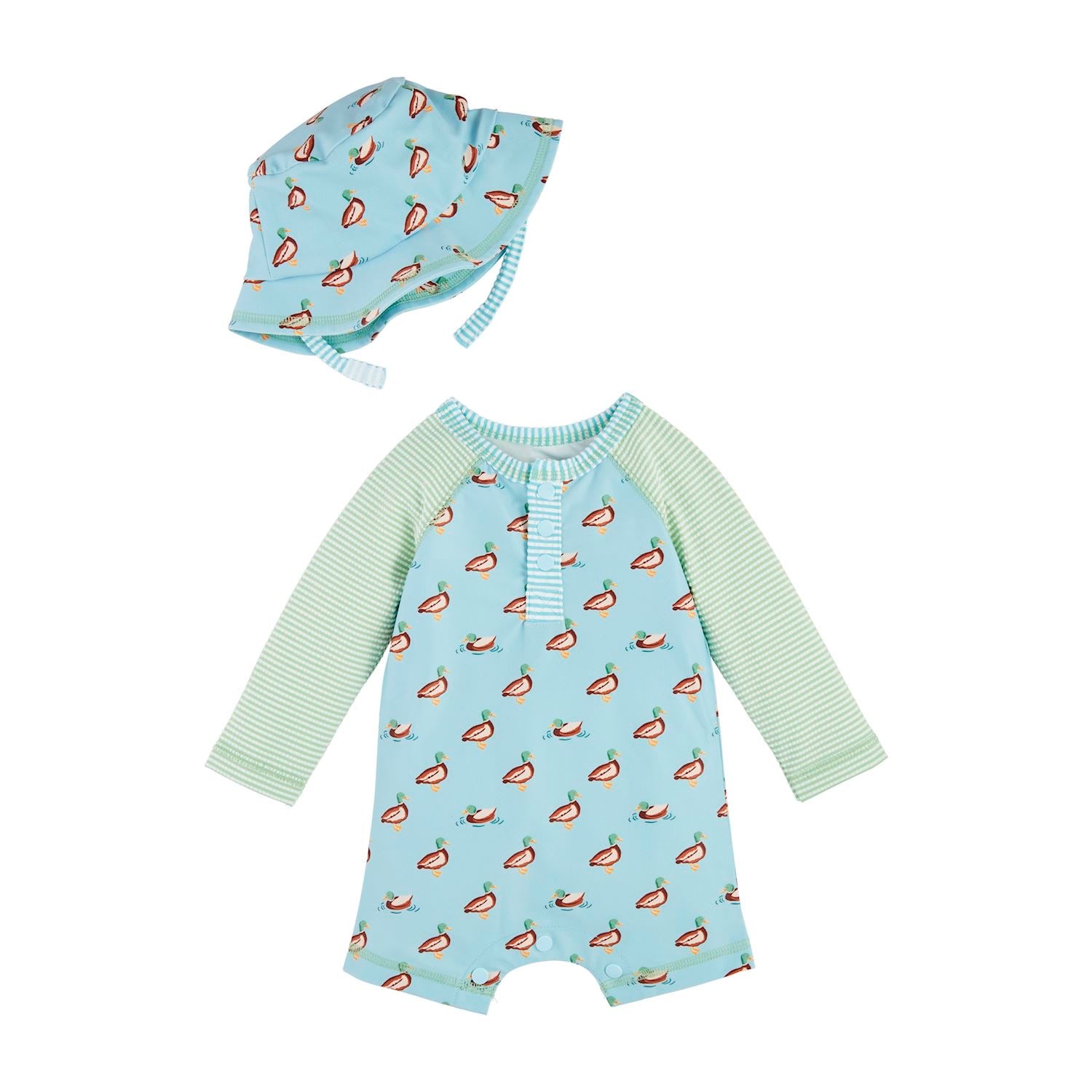 2-piece set. Nylon spandex rash guard one-piece features raglan seersucker nylon spandex long sleeves and chest placket snaps. Inner leg snaps. Comes with coordinating bucket hat with chin strap.