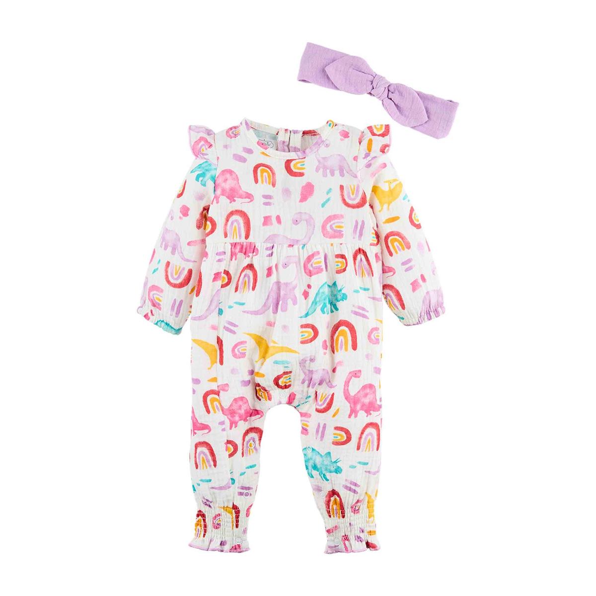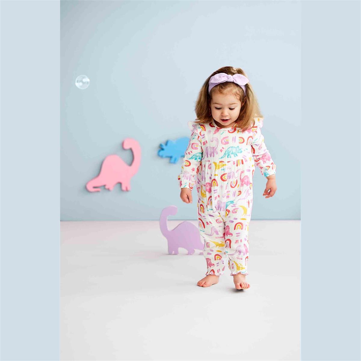 Discover our captivating Girl's Dino Baby Bodysuit, showcasing an enchanting print that is sure to become your newfound favorite. This delightful two-piece ensemble includes a charming one-piece bodysuit crafted from soft cotton gauze. With flutter ruffle shoulders and an inner leg snap closure, this bodysuit offers both style and convenience. Complete with a coordinating bow headband, the outfit is adorned with a vibrant dino print, adding a splash of color to your little one's wardrobe. Made from 100% Cotton, this bodysuit ensures optimal comfort and breathability. For easy care, simply turn it inside out and machine wash on cold with like colors. Afterwards, tumble dry on low, and your little dino lover will be ready for more adventures!