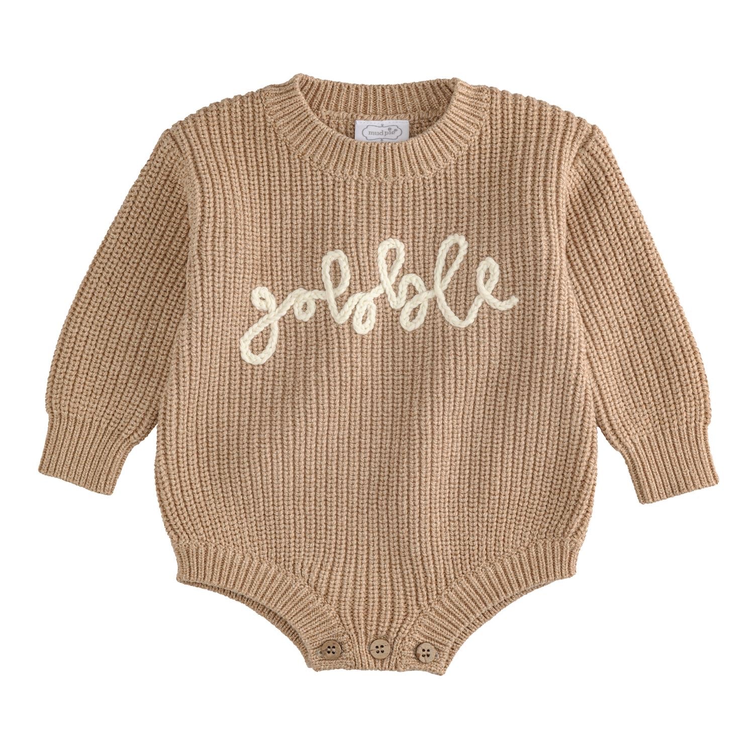 The Gobble Chainstitch Baby Sweater Bubble is a charming and cozy addition to your little one's wardrobe. Crafted from 100% cotton, this long sleeve sweater knit bubble ensures softness and comfort for delicate skin. The intricate chainstitch embroidery adds a touch of elegance and style, making it perfect for any occasion. Designed with practicality in mind, it features a coconut wood button inner leg closure for easy diaper changes.