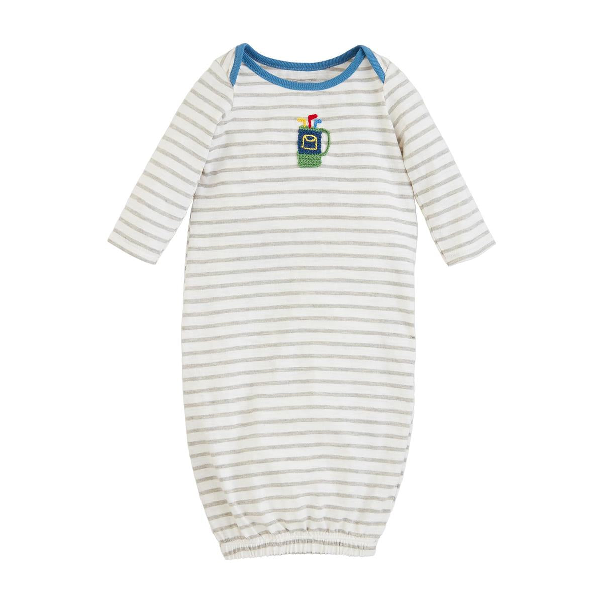 Cotton slub sleep gown features crochet chest applique.