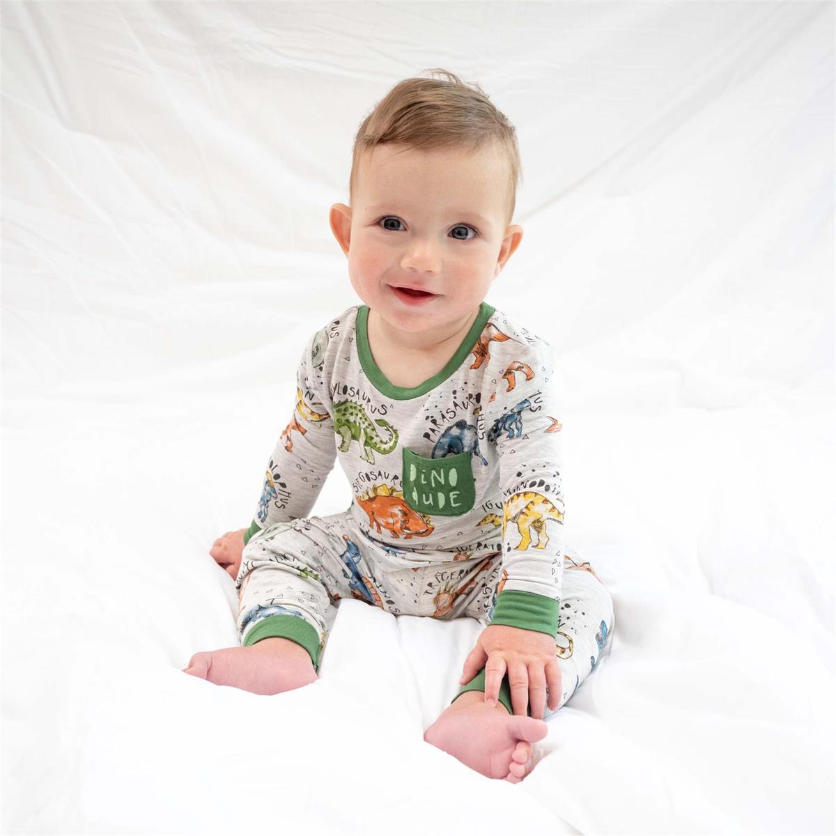 Your little dino dude needs our Boys' Dino Pajamas. This adorable two-piece set includes a cozy long-sleeve pajama top and coordinating pull-on pants. Crafted from incredibly soft knit bamboo fabric, these pajamas ensure maximum comfort for your child throughout the night. The pajama top features an embroidered chest pocket, adding a charming touch to the ensemble. For sizing, we recommend choosing a larger size if your child is in-between sizes, as these pajamas adhere to CPSC child safety regulations, designed to provide a snug fit. Our pajamas are made with 96% Viscose made from Bamboo and 4% Spandex for durability and stretch. To maintain their quality, simply turn them inside out and machine wash on a cold cycle with like colors. For drying, tumble dry on low for best results.