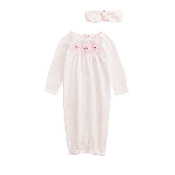Made from soft, breathable 100% cotton interlock fabric, this gown ensures your little one's comfort and warmth. The gown features exquisite chest smocking adorned with delicate embroidered rosebuds, adding a touch of elegance to this adorable outfit. A ruffle hem enhances its sweet, feminine appeal. Accompanying the gown is a coordinating bow headband, perfectly matching the gown's design for a complete, picture-perfect look. Sized for 0-3 months, this set is an ideal choice for bringing your baby home or for any special occasion.
