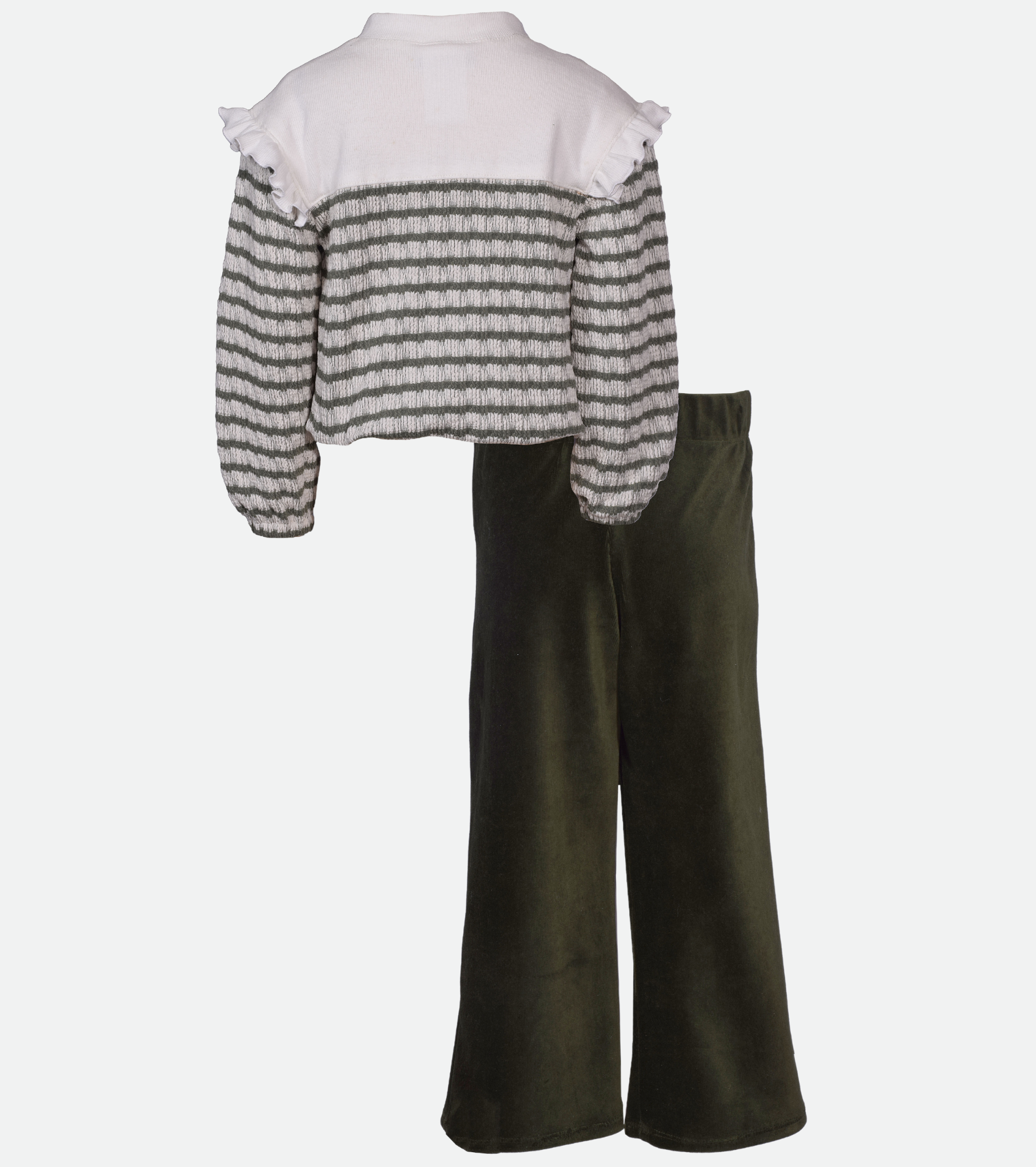 One-and-done chicness! A striped sweater with ruffly bib collar meets knit corduroy pants for a coordinated cool look.