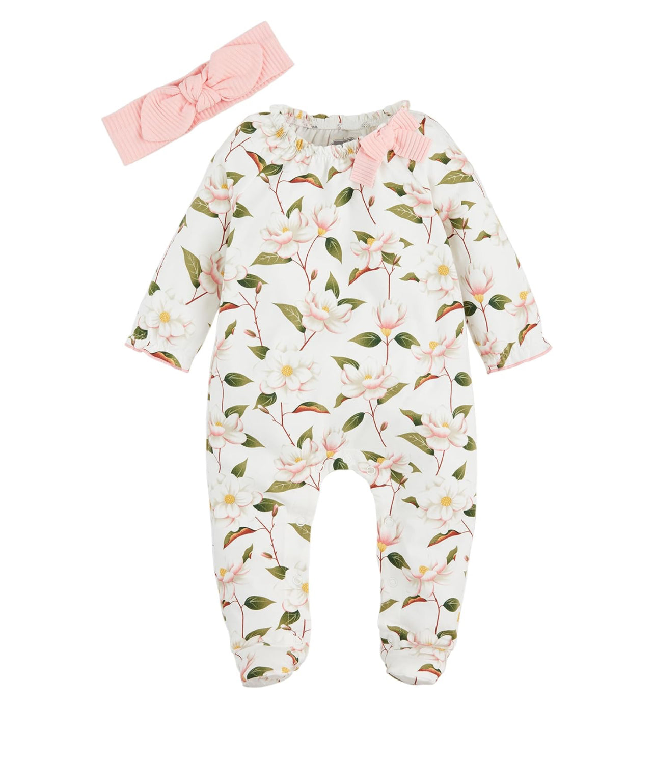 Elevate your baby's comfort and style with our Magnolia Printed Baby Sleeper 2-piece Set. This set includes a cotton spandex footed sleeper and a cotton rib bow headband. The sleeper features an elasticized neckline with a charming bow and sleeve openings, as well as inner leg snaps for quick changes. To maintain their charm, simply turn both the sleeper and headband inside out and machine wash cold with similar colors. Avoid bleach and opt for a gentle tumble dry low. If necessary, a cool iron can be used. Crafted from a cozy blend of 95% Cotton and 5% Spandex for the gown, and 93% Cotton and 7% Spandex for the headband, this set offers both comfort and adorable style for your baby.