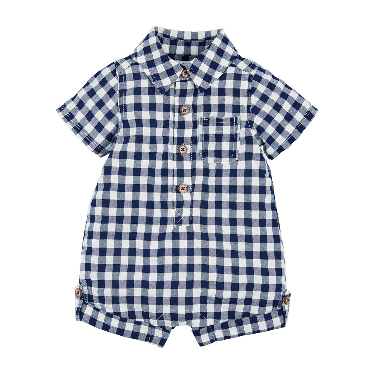 Collared gingham shortall features coconut wood button placket, chest pocket and turned leg openings. Inner leg snaps.