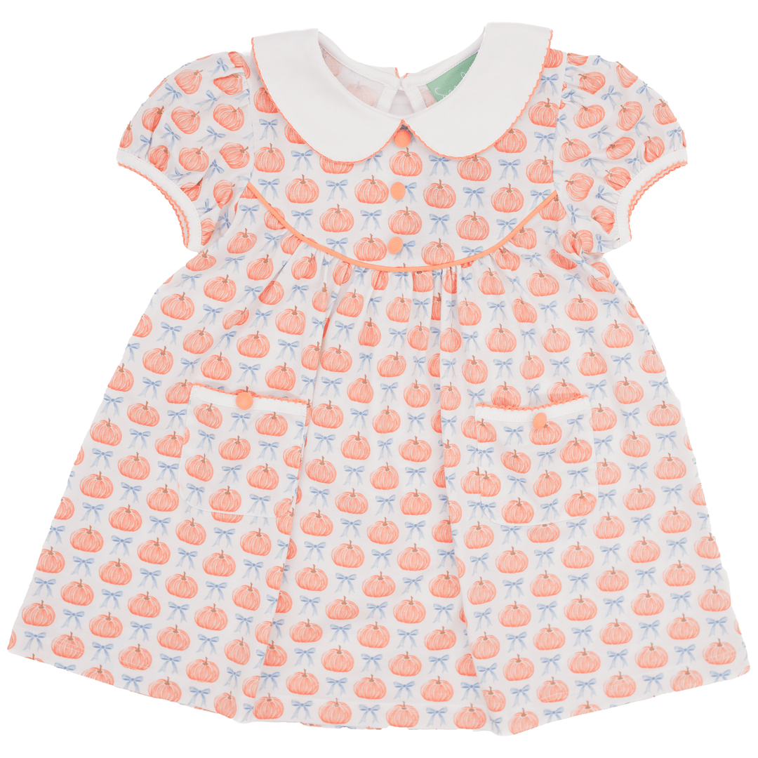 Get ready for Thanksgiving with the Orange Pumpkins Dress! With an adorable Peter Pan collar, cute buttons along the chest, and fun orange trim, this outfit is perfect for your girl. The playful orange pumpkins print adds a whimsical touch to this unique and quirky design.