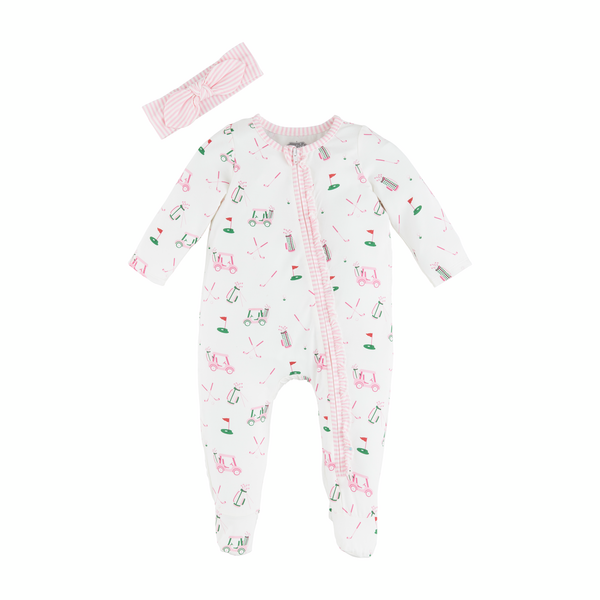 The Pink Golf Baby Sleeper And Headband Set is a delightful 2-piece set that is perfect for your little one. This set includes a cozy knit bamboo ruffle footed sleeper and a matching bow headband. The sleeper is made from soft and breathable knit bamboo fabric, ensuring that your baby stays comfortable all day and night. The footed design keeps their little feet warm and snug, while the ruffle detailing adds a touch of sweetness. To complete the adorable look, the set also includes a bow headband. This headband is adjustable and features a cute bow detail, adding a charming finishing touch to any outfit.