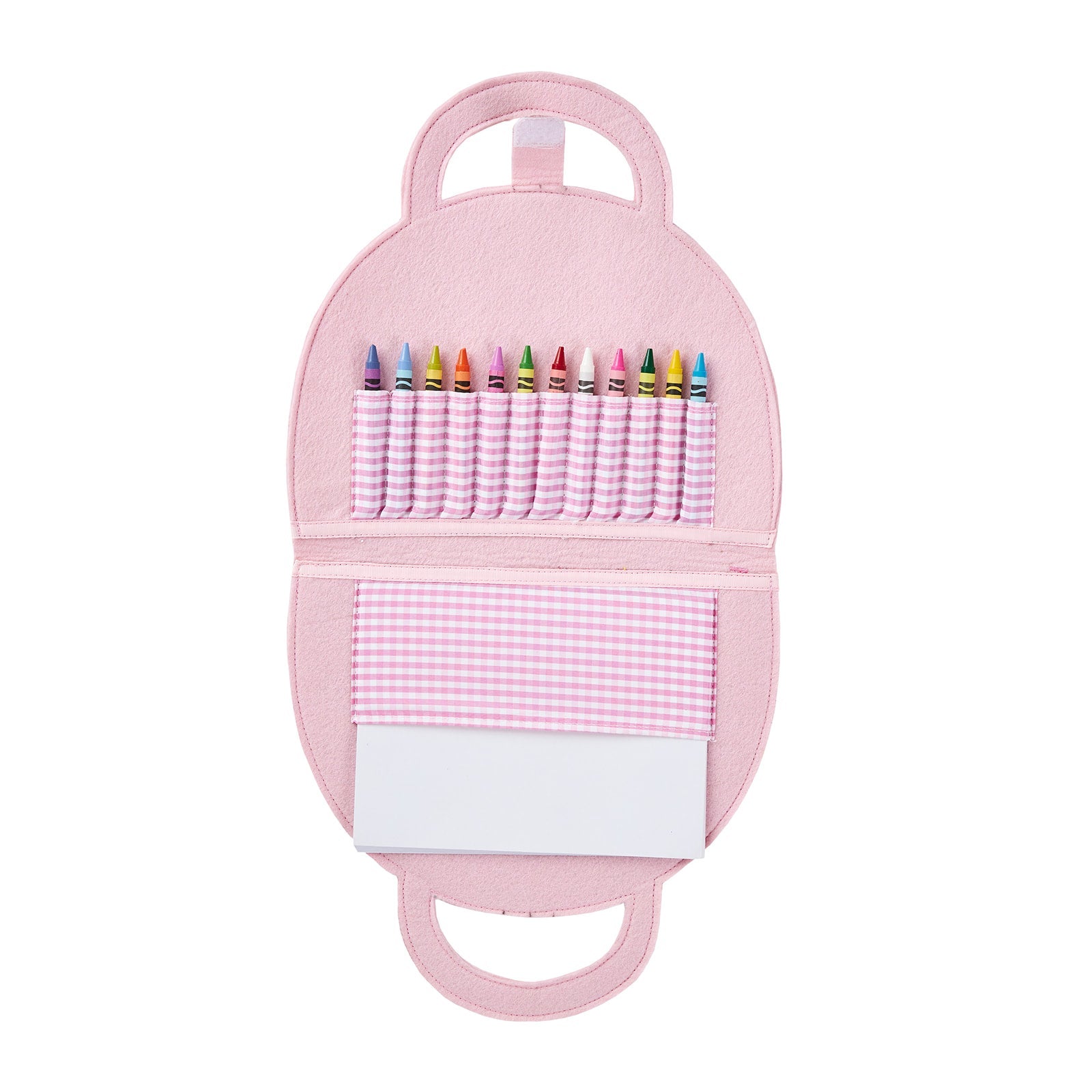 Color anywhere with this adorable Rainbow Art Folio Set. The set comes with a felt portfolio that is shaped like a rainbow. The folio includes a drawing pad and 10 crayons of fun colors. This set is perfect for on-the-go entertaining. The art folio is intended for children ages 3 and up.