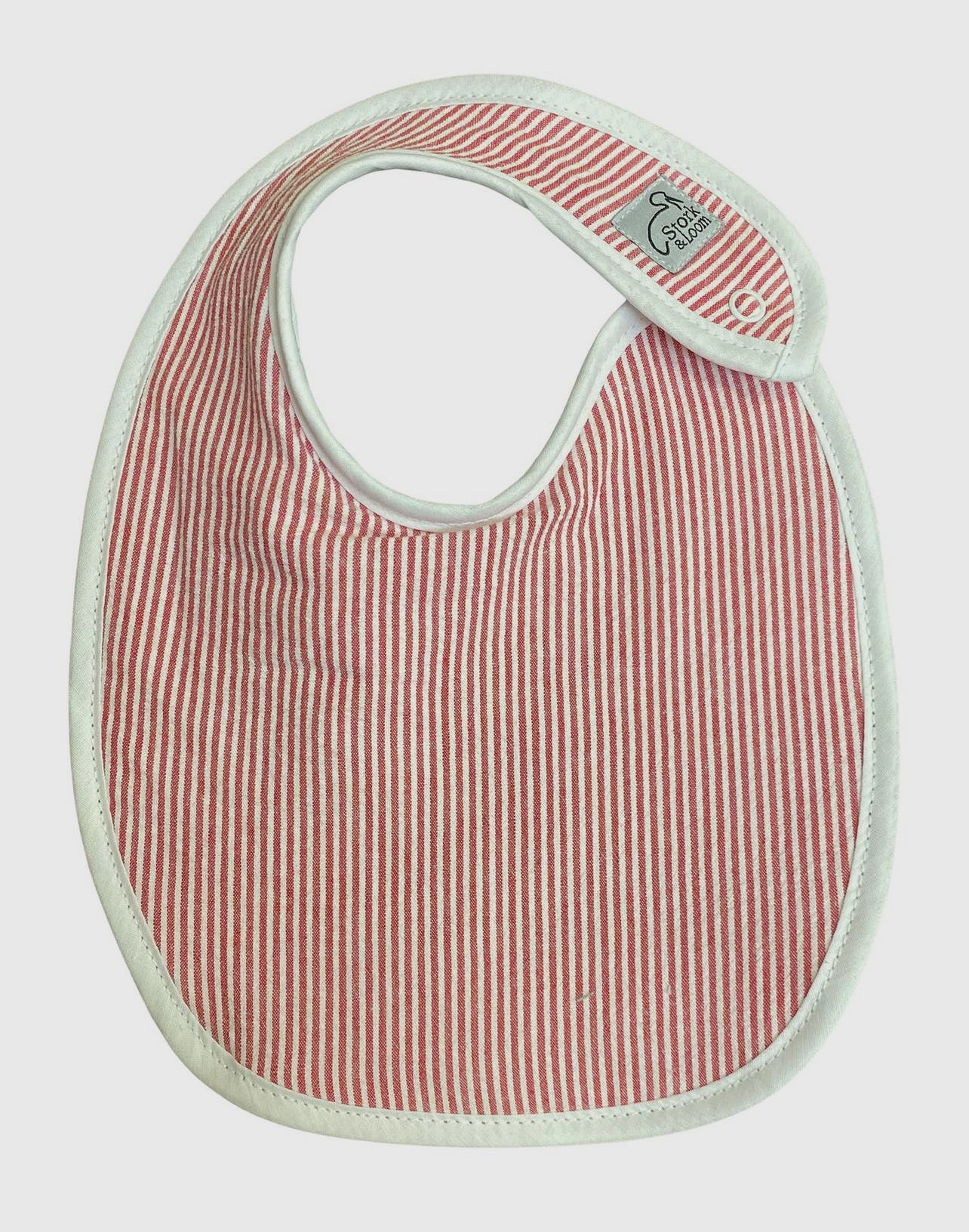 Red seersucker fabric front and 100% soft cotton terry cloth back make these bibs super absorbent and comfortable for your baby. There is a snap neck closure on the sides.
