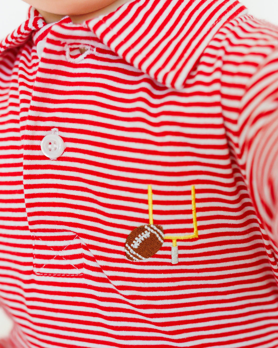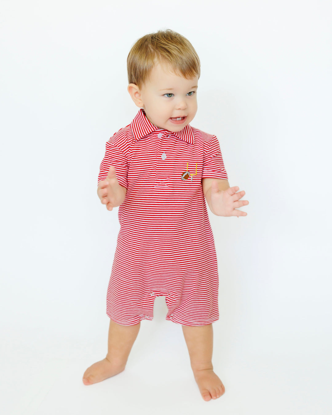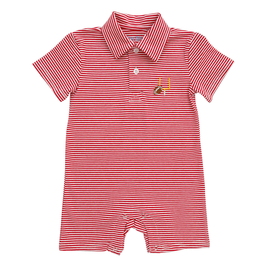 Get ready for game day with this playful polo romper featuring red stripes and a fun embroidered football detail. Perfect for cheering on the team in style and comfort!