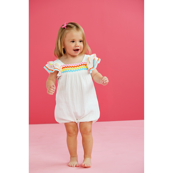 The Ric Rac Trim Baby Romper is a delightful and charming piece crafted from soft and breathable cotton gauze fabric. With its beautiful ric-rac trim on the chest and flutter sleeves, this romper adds a touch of whimsy and playfulness to its design. It is designed with convenience in mind, featuring inner leg snaps for easy diaper changes. Taking care of this romper is a breeze as well, simply turn it inside out and machine wash cold with like colors. To maintain its quality, it is recommended to avoid using bleach and tumble dry on low heat. Made from 100% cotton, this romper ensures utmost comfort for your little one's delicate skin. The fabric is soft and gentle, making it perfect for all-day wear. If needed, the romper can be easily ironed on a cool setting. Overall, the Ric Rac Trim Baby Romper is a stylish and practical choice that offers both comfort and adorable style for your baby
