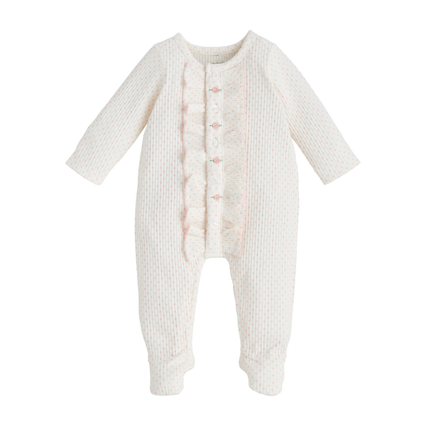 The Rosette Polka Dot Baby Sleeper is a charming and comfortable choice for your little one. Crafted from a soft cotton rib blend, this footed sleeper ensures a cozy fit with its 93% cotton and 7% spandex composition, providing just the right amount of stretch. The design features a delightful ruffle pearlized button placket adorned with elegant rosette embroidery, adding a touch of sophistication to the playful polka dot pattern. Practical inner leg snaps make diaper changes a breeze, while the footed design keeps tiny toes warm.