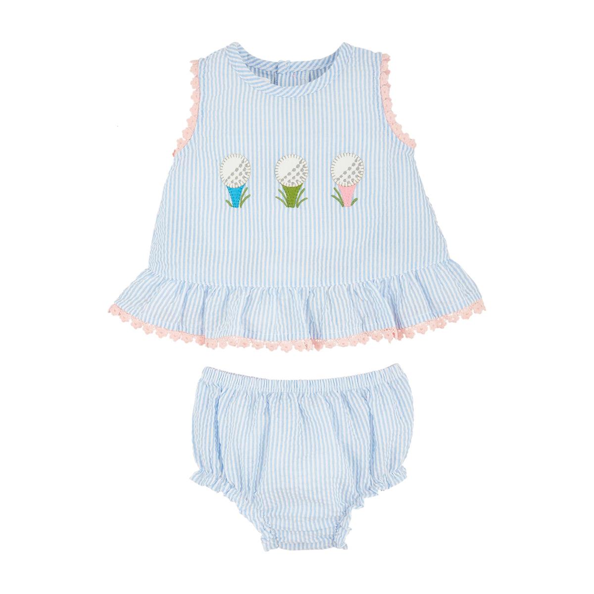 2-piece set. Appliqued seersucker pinafore features flounce hem and crochet trim. Comes with coordinating bloomers.