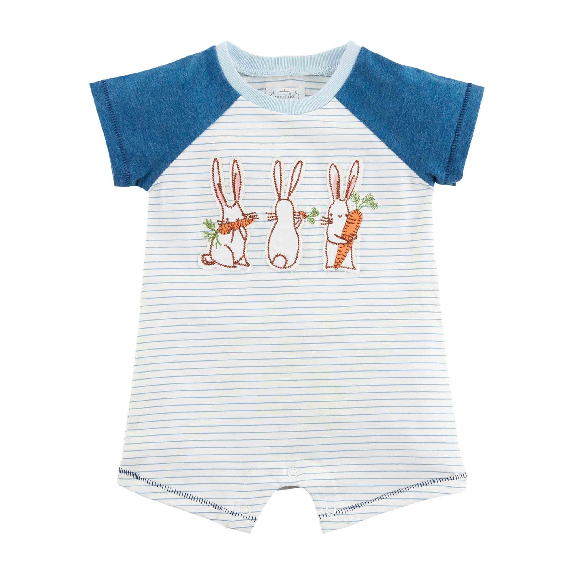 This Striped Bunny Baby Shortall is eggsactly what you're looking for this Easter! The appliqued cotton spandex shortall features raglan short sleeves. The striped shortall features an inner leg snap closure. The striped shortall features Easter bunny images in the center of the it.