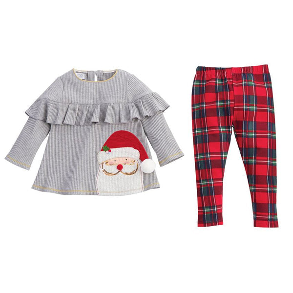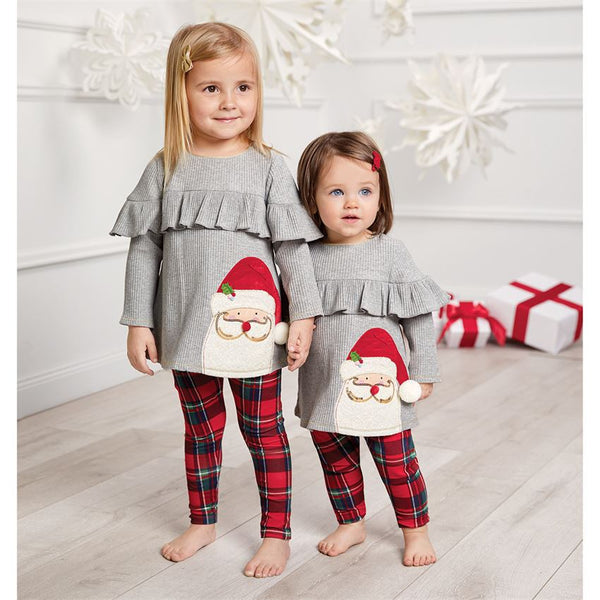 2-piece Tartan Santa Tunic Legging Set. Cotton rib long sleeve tunic features chest ruffle, piped neckline and lurex sweater knit Santa appliqué with velvet button nose, velvet hat and felt and pom-pom details. pairs with cotton spandex tartan leggings.