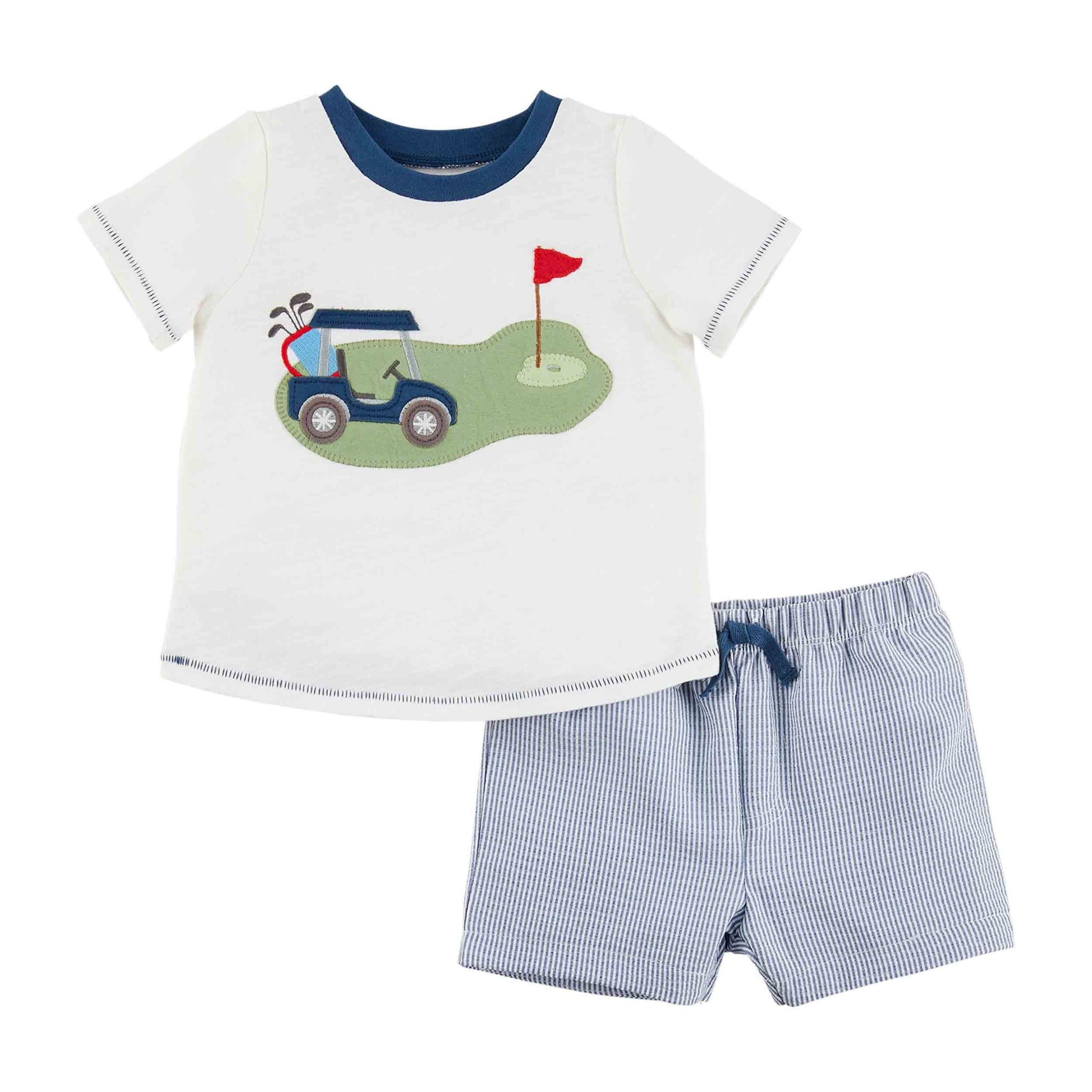 If golf is your favorite season, your little one needs this Toddler Golf Short Set. The two piece set comes with an appliqued cotton slub t-shirt. The tee-shirt features a navy neckline with an image of a golf course on the front. The t-shirt comes with pull-on seersucker shorts.