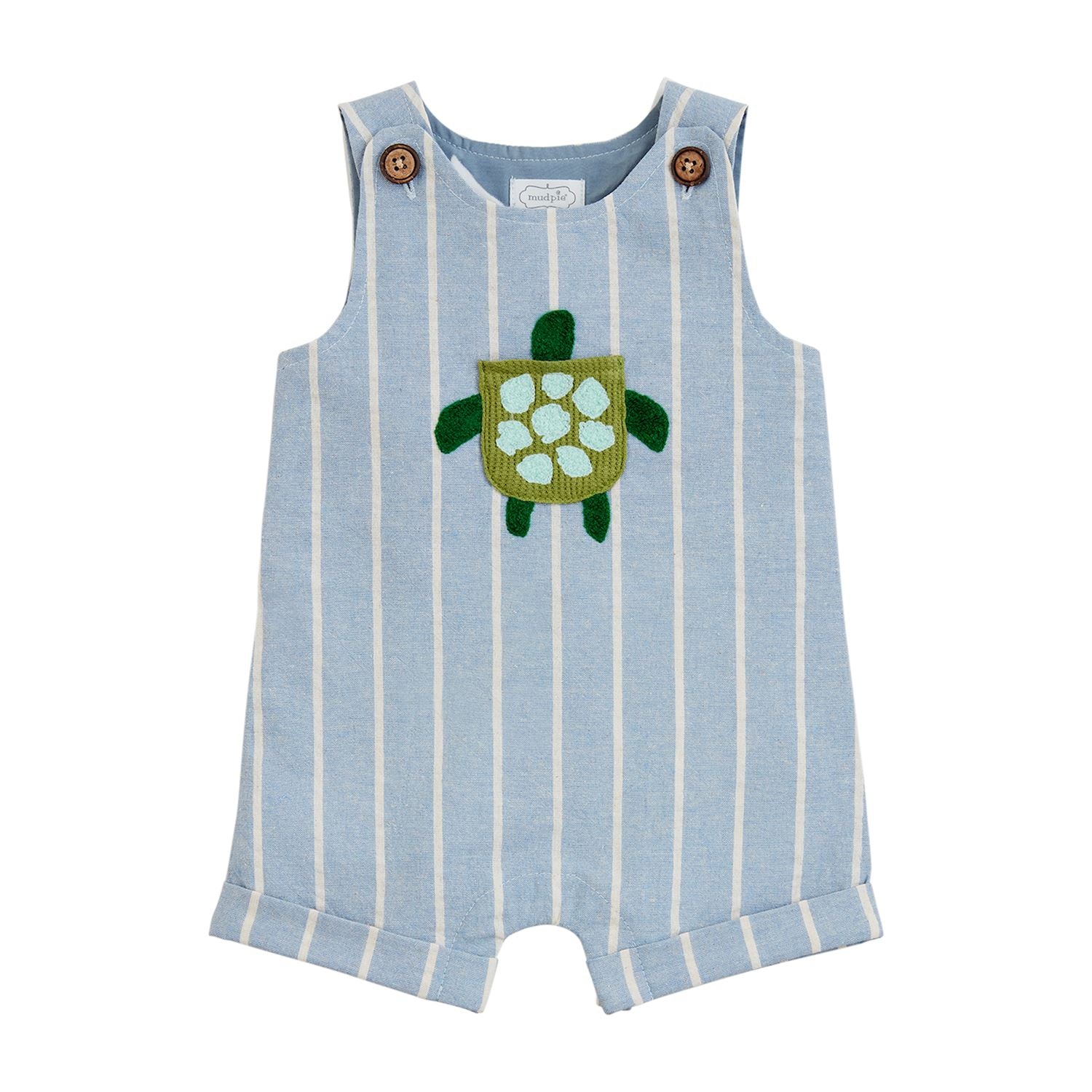 Linen shortall features turtle applique pocket, coconut wood button shoulders and inner leg snaps.