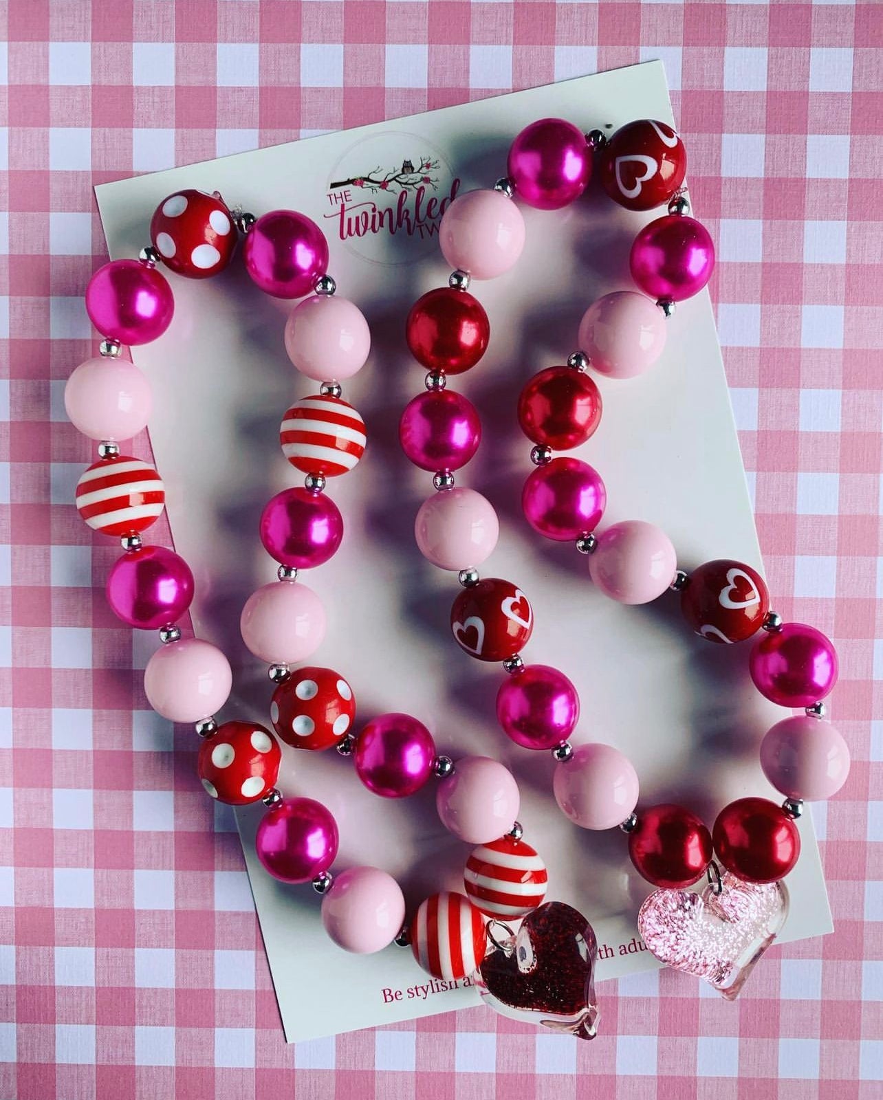 Pink or red glitter heart charm with a variety of pink and red beads