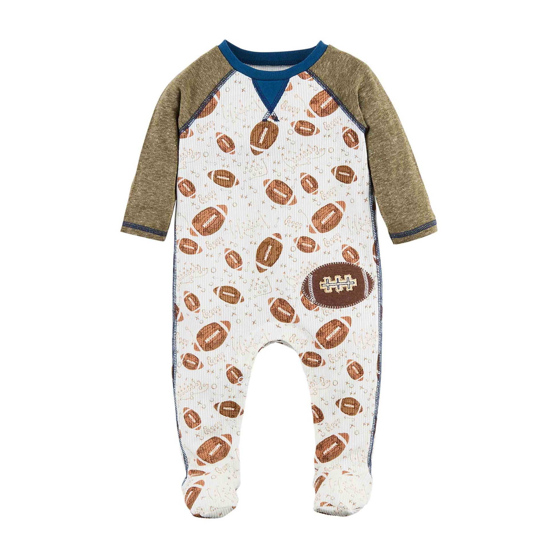 When it's time to watch the game with Dad, grab this Waffle Football Baby Sleeper. This adorable baby sleeper showcases intricate appliqued details and is crafted from cozy waffle weave fabric. With its footed design and cotton slub raglan sleeves, this sleeper ensures maximum comfort for your little one. It features an inner leg snap closure for easy diaper changes. For optimal fit, we recommend sizing up if your child is in-between sizes. Rest assured, this sleeper complies with all CPSC child safety regulations, guaranteeing a snug and secure fit. The body of the sleeper is composed of 59% Cotton, 39% Polyester, and 2% Spandex, while the sleeves are made from 55% Cotton and 45% Polyester. For hassle-free cleaning, simply turn the sleeper inside out and machine wash it on a cold cycle. For drying, tumble dry on low for convenience.