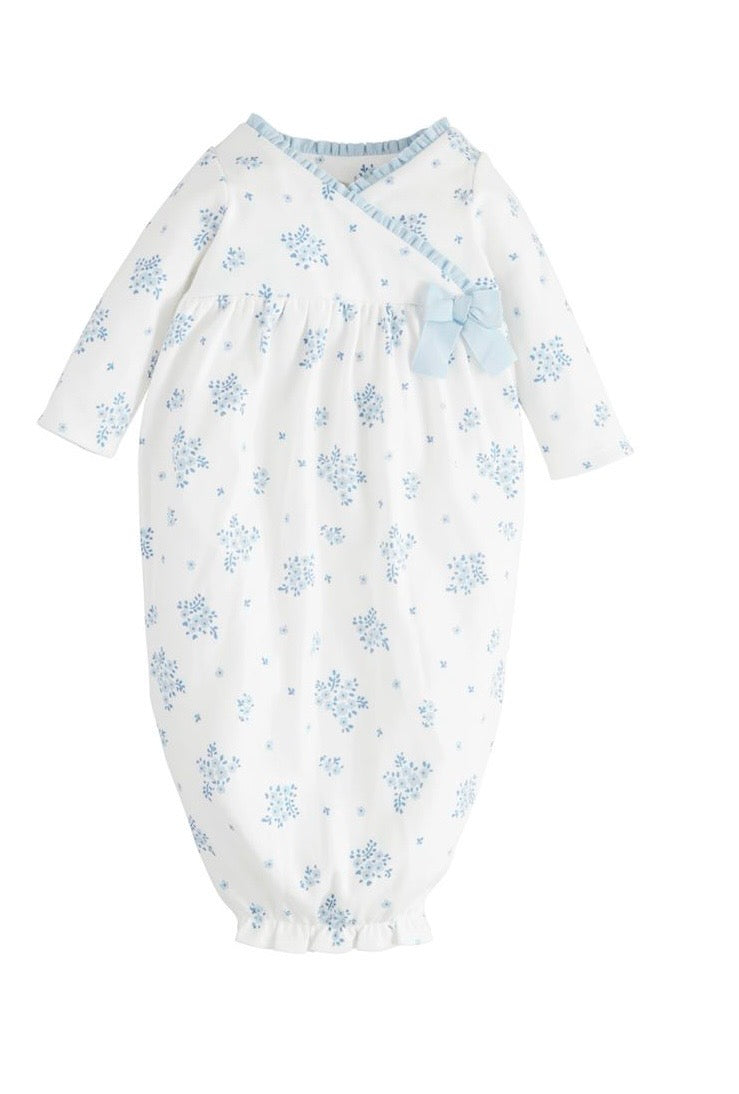 Cotton interlock sleep gown with kimono side bow and ruffle hem.